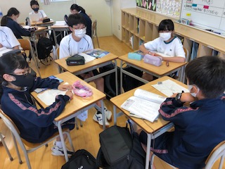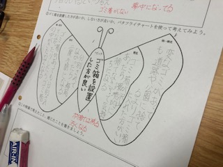 一年生の道徳では「あったほうがいい?」を題材に、バタフライチャート呼ばれる思考ツールを使って学習しました。中央に書き入れたトピックについて、賛成、反対、強い賛成、強い反対の意見を持つ人の気持ちになって、その意見や理由を書き入れました。