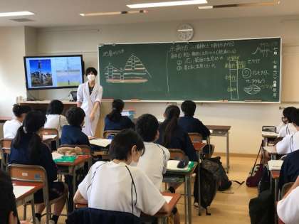 2年生の理科の授業です。化石と地層の学習をしています。土に埋まっていた化石を調べることで、その地層がどのくらい古いものかとか、同じ地層のものからいろいろな当時の環境を推測することができることを学びます。(副校長)
