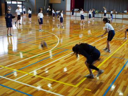 上の画像はバレーボールだとすぐわかります。下の画像は?これ、実は色々なボールに慣れる練習のひとつで、サーブやレシーブが床に強く当たって跳ね返ったものを受ける、という想定の練習。跳ね返りボールを作り出すために強く床に当てているところです。