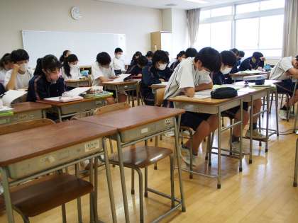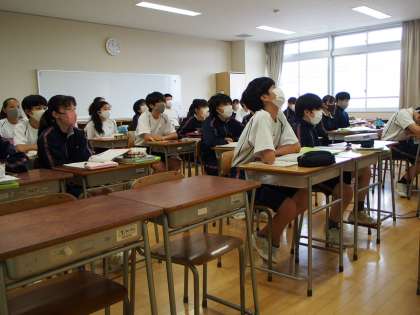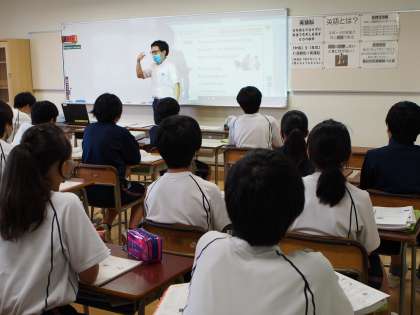 「英語は使わないと、使えるようにならない」このコンセプトのもと、授業プログラムをしっかりと組んで行っています。下2つの画像は「英語脳」を鍛えるために、教科書本文をセンテンスごとに短時間で暗記し、顔をあげ、相手に向かって言う練習てす。