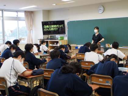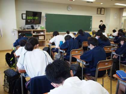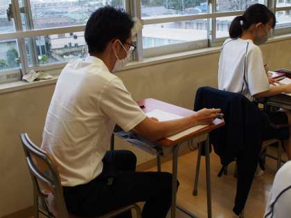 期末考査前ということもあり、今日は室町時代を中心としたテストをやっています。もちろん、ただ歴史用語を書くのではなく、文章で記述するスタイルです。真剣な眼差しで答案を書く10期生。あれっ、その中におとながひとり混じっています。担任の先生が?なぜ?