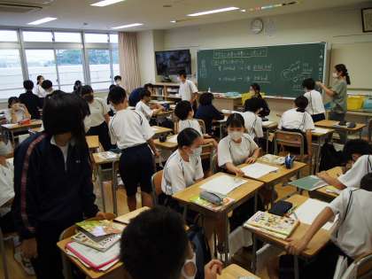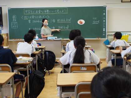 「中学生に必要な栄養について」を考えています。中学生が1日活動するのに必要なエネルギーを計算し、それにふさわしい献立を考えます。発言をよくするのが11期生のよいところ。そして話合いのために机を向かい合わせにしますが「何となく班の形にしますよ」という指示を理解して、間隔を空けています。そして、献立カードを共有するために、まずは手指の消毒から。これも日常の風景となりました。