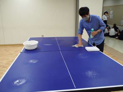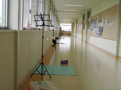 「消毒をするとどうしてもプラスチックのボールは強度か落ちて割れやすくなりますが、それも仕方ありません」といいながら、卓球部顧問は生徒が休憩中に卓球台やボールをこまめに消毒をしています。そして吹奏楽部。人気のない4階廊下にソーシャルディスタンスをとって譜面台を置いています。