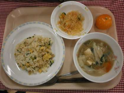 「青菜のチャーハン」は、チンゲン菜やエビなどの具材を炒めてごはんに混ぜました。シンプルなチャーハンでおいしいですよ。