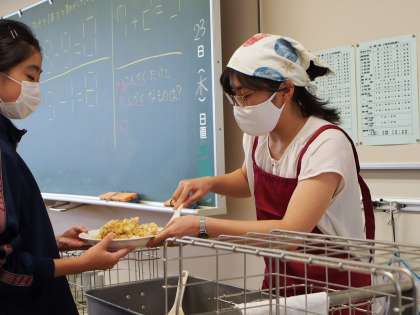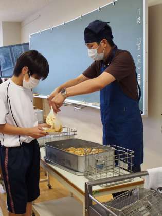 中学校の初めて給食が始まって今日でちょうど1ヶ月目を迎える11期生の担任は、給食の配膳がひととおり終わってから、お代わりが欲しい生徒に「もやしご飯」を盛りつけています。愛情あふれるひとコマです。
