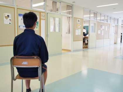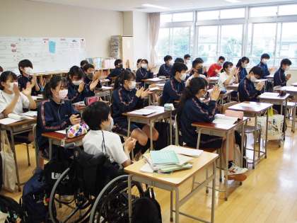 各階段踊り場付近に座る生徒は何をしている?そう、各委員会の前期活動方針に賛成する拍手の数(勢い?)をチェックして放送室にいる司会に伝える役目を担っています。