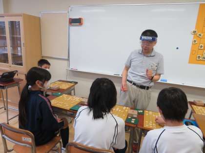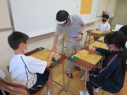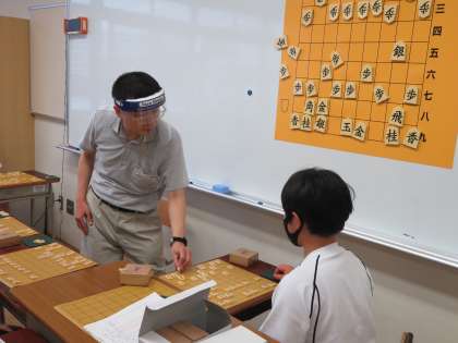 今日は、プロの棋士の方に来ていただき、将棋の指南をしていただいています。感染症対策として、フェイスシールドも装着し、安心・安全に充実した活動に取り組んでいます。(田村)