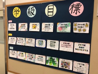 例年なら生徒総会で体育館に飾る学級目標でしたが、今年は放送での総会になったため、生徒会の掲示板を活用しました。3-4の目標に「みんなの心はBluetooth」とありました。離れていても心は繋がる。クラスの温かさが伝わりました。他にもクラスの個性が出ている目標ばかりで素敵でした!