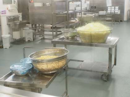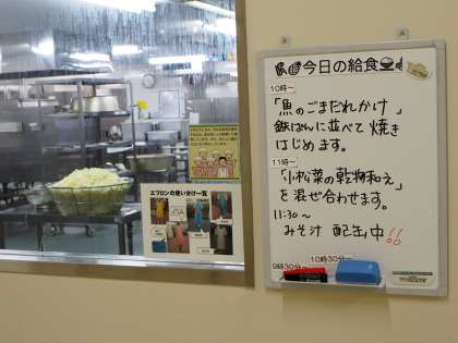 昨年もホームページにたびたび登場した給食調理室にあるガラス張りコーナー。久しぶりに行くと、ホワイトボードに各メニューの調理時間目安が書かれています。時間があえばぜひお立ち寄りあれ。