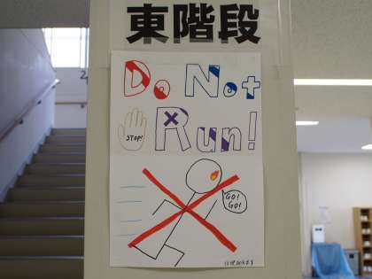 梅雨時に特に注意するのは校内での転倒事故です。ひとりひとりの注意を促すために階段に貼ってくれたポスター、みんな見えてるかな?