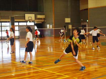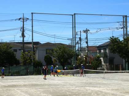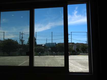 パドミントン部の様子を撮影している体育館からふと校庭に目をやると…そこには真夏の陽ざしのもと、硬式テニス部が活動しています。夏休みならではの風景です。