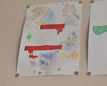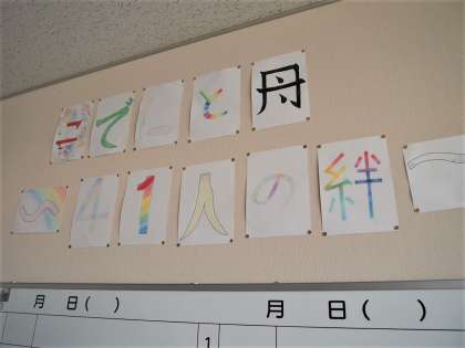ほとんどのクラスは、教室後ろのホワイトボート上の空間を利用して学級目標を掲げています。近づいてみると、文字にかわいいキャラクターの装飾がされているものが多いことに気がつきます。
