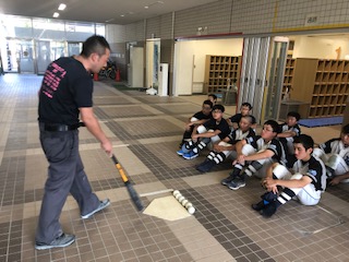 ※写真はベンチ前整列の様子とバッターボックスの使い方について確認のミーティングです。(石塚)