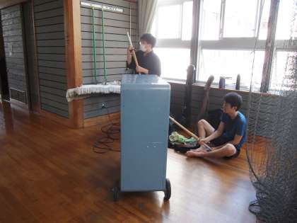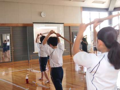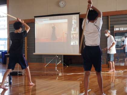 続いて素振り練習もオンライン映像に合わせてのもの。お手本は武道具店の店長さん。剣道6段の腕前です。とてもわかりやすい。今日は8期生の先輩も応援に来てくれています。