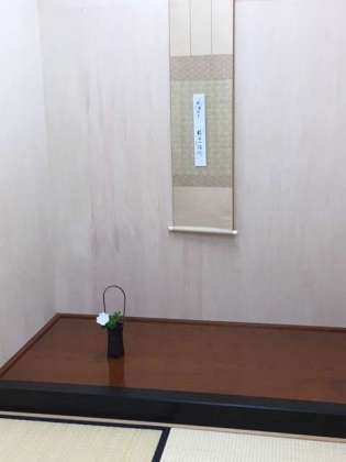 活動場所には床の間があります。毎回お稽古に、講師の先生がお花を飾ってくださいます。今日のお花はむくげです。