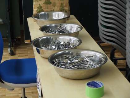 例年ならば1学期で終了していたはずの健康診断が9月にめじろおしとなっています。今日の歯科検診を皮切りに、心臓、内科、眼科と続きます。昨年までは歯をチェックする器具は1本だけでしたが、今年は感染症予防のため直接手を触れないよう、両手に器具をもって検診をしています。終わったあとにはおびただしい数の器具が。。。もちろん、これを全て消毒してから専門の業者に渡し滅菌をしてもらいます。