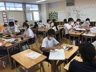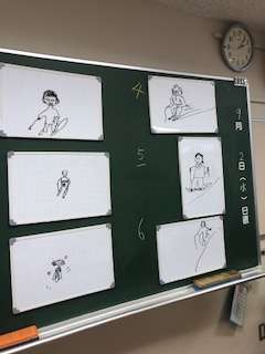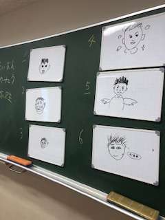 二学期が始まり、席替えも行ったので新しい仲間とエンカウンターを行いました。示されたテーマについての絵を6人1組、待ち時間1人5秒ホワイトボードを回しながら描いていきます。みんなで回すのでヘンテコな絵も登場して盛り上がりました。二枚目のテーマは「スキーをしている野々山先生」、三枚目は「石塚先生」です!
