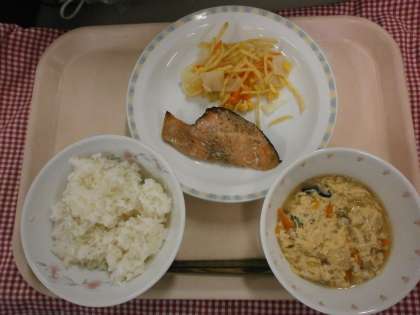 主菜は、「鮭の南部焼き」です。魚の南部焼きは、魚に下味をつけてごまをふりかけて焼いたものです。ごまは、ごま油がとれることからもわかるように、その成分の55%は脂質です。しかし、セサミンという強い抗酸化作用がある成分が入っており、体を守ってくれる作用があります。ぜひ、残さず食べてください。