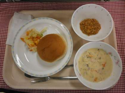 「ニューイングランドチャウダー」は、アメリカ東海岸発祥の白いチャウダーです。トマトを使った赤いチャウダーはマンハッタン風のチャウダーと呼びます。今日の給食では、アサリや鶏肉、じゃがいも、コーンなど具だくさんに仕上げました。