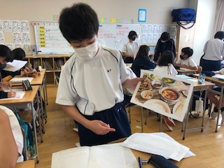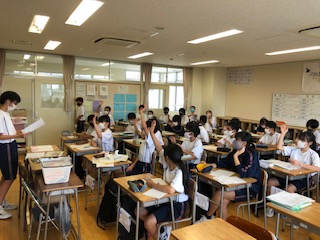 一年生の社会科では世界の国新聞の発表会を班内発表→代表者選出→クラス発表の流れで行いました。クイズ形式で発表する人、新聞記事を持参する人、写真を持参する人など色々な工夫があり聞き応えのあるものになりました。