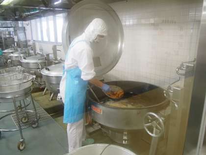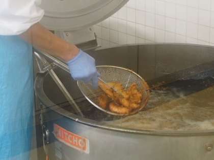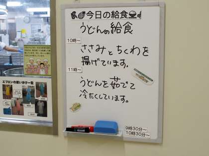 給食室前を通ると「ささみとちくわを揚げてます」の文字が。。思わずカメラを取りに戻って撮影!今日の「冷しごまだれうどん」のトッピングです。