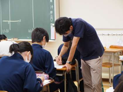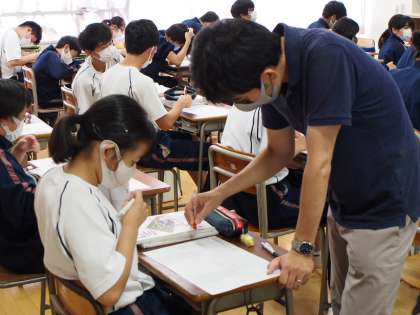 グラフを描いている間、机の間をていねいに回って、ひとりひとりのグラフを確認し○を付けてアドバイスをしています。こういう丁寧な指導がフナキボ生の「やる気」を引き出すことにつながるのですね。