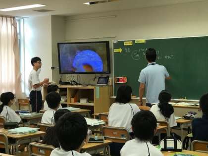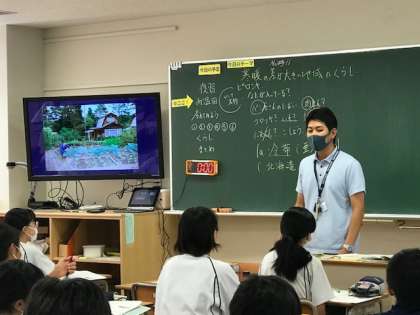 1年生の社会の授業です。地理で寒暖差の大きな気候で生活する様子について学んでいます。寒帯にはない食材である野菜が入った、ロシアのピロシキの食レポを導入に、冷帯の生活の特色や、寒暖差がなぜ大きくなるのかにもせまります。(副校長)