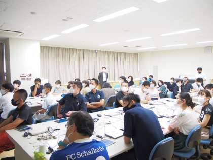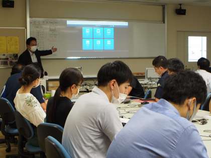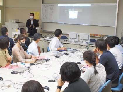 放課後にパソコン室に集まった大勢のフナキボの先生たち。今年度中に生徒ひとりに一台のパソコンが配布予定ですが、スクールギガ時代に備え、オンラインでの学習をどのように進めていくのかを研修しています。講師の先生に説明していただいているのは、タブレットを通して双方向で進めることができるオンラインソフトの使い方です。