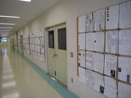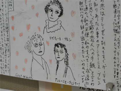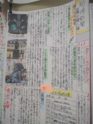 そして音楽室前には夏休みの宿題である「ベートーベン新聞」が掲示されています。中学に入って初めての新聞の宿題とは思えない!表現力と質の高さにびっくりです。