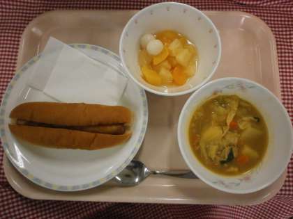 今回のパンは、「ホットドッグ」です。「ホットドッグ」は、ウインナーをパンに挟んだ食べ物です。これは、アメリカに移民したドイツ人が広めた料理と言われています。この日の給食では、焼いたパンに長いウインナーをはさんで出しました。