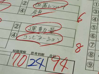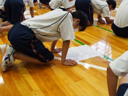 実技教科の筆記試験が先週終わり、今日の体育はその答案返却です。模範解答を受け取った11期生は、眼を皿のようにして返却してもらった自分の答案と見比べています。一番したの画像は、持ち主のフナキボ生に許可を取ってパチリ。このくらいの点数をめざしていた生徒が多かったのかなあ。