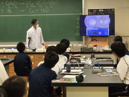 2年生の理科の授業です。化学変化について学習しています。割り箸は燃やすと軽くなるのに、スチールウールは重くなることを動画で見た後、炭酸水素ナトリウムに塩酸を入れて、重さが減ることを実験して確認しました。(副校長)
