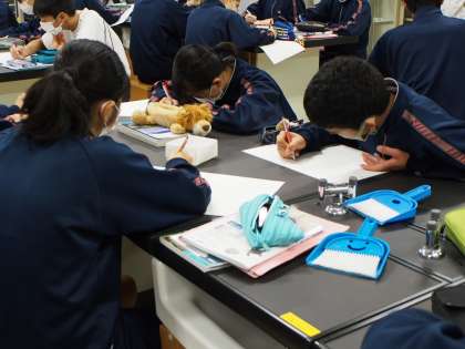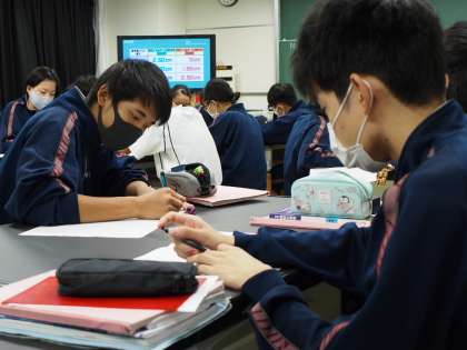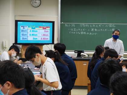 9期生がエネルギーについて学んでいます。動画視聴のあと、運動エネルギーと位置エネルギーの関係にいて予想をたてます。