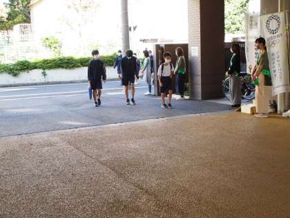 秋晴れの朝、3年3組の保護者の方のご協力であいさつ運動がおこなわれています。生徒の足どりもこころもち軽い気がします。やはりよい天候だとで気持ちも軽やかになりますね。