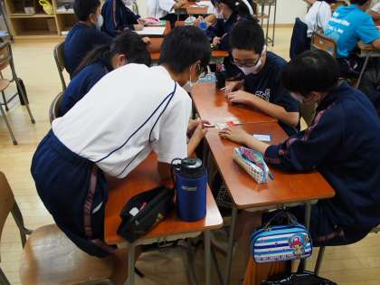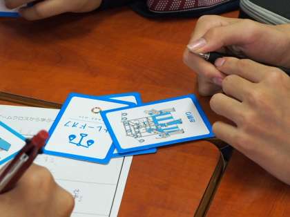 例えば、一番上の画像が「トレーディングカード」と課題。真ん中の画像が手持ちの「リソースカード」。つまり水不足を解決するために、井戸を掘ったら地盤沈下で家屋が今にも崩れそうになっている、という危機を「お祭り」を使ってどう乗りきるのか、というとてつもなく常識破りの難題です。思わずみんな「えっ?」と身を乗り出してしまう気持ちも十分わかります。