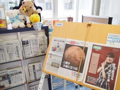 ちなみに、このSDGsアクションカードゲームでヒーローになれる秘訣を教えましょう。それは、各クラスにある新聞に毎日目を通すこと。NIEコーナーに立ち寄り、キャラクターたちを可愛がるついでに、新聞を開いてみること。なんといっても新聞にはSDGsの課題と解決策が毎日たくさん出ていますから。フナキボはクラスに複数の新聞、そしてNIEコーナーには一般紙に加え、中高生新聞も最新号が毎週届いていますよ。