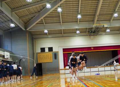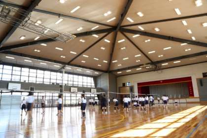体育館の天井の写真が今と違うので、当時からいる先生に聞いてみると「体育館は船橋中学校当時のままですが、耐震工事をしています」とのこと。上2枚が6年前のもの。そして一番下が現在の体育館。照明がLEDに代わっています。
