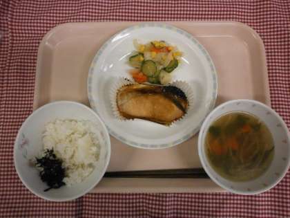 今日の魚は、鮭です。鮭に味噌とマヨネーズを混ぜたソースを上にのせて焼きました。ごはんともよく合う味付けです。残さず食べましょう。