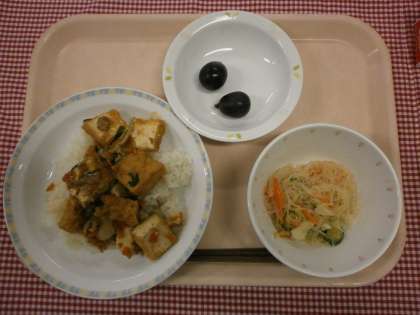 家常豆腐は、中国の四川の豆腐を使った家庭料理です。四川料理では珍しい、辛くない料理です。今日の給食では、ごはんにかけて丼ぶりにしていただきます。