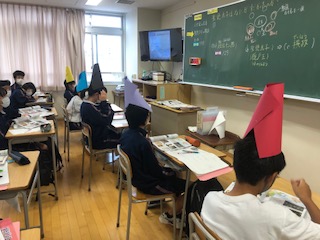 一年生の歴史では「聖徳太子の政治」の学習をしています。聖徳太子の代表的な政策、冠位十二階を手作り冠で体験しました。当時の役人が頑張ろうとする意味が分かりました。