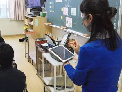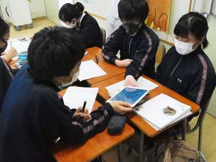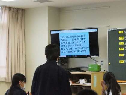 そして自分たちの発表をしていきます。モニターにはロイロノートの発表原稿と資料がパッチリ映ります。で、さらにモニターから遠い班では自分たちのもっているタブレットに大画面と同じ画像が写るのでそちらで見ることもできる。すぐれものです。