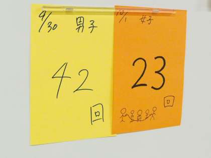 何といってもみんなの力を合わせるハイライトは大縄です。練習ごとに伸びていく記録をさらに伸ばすための表示です。