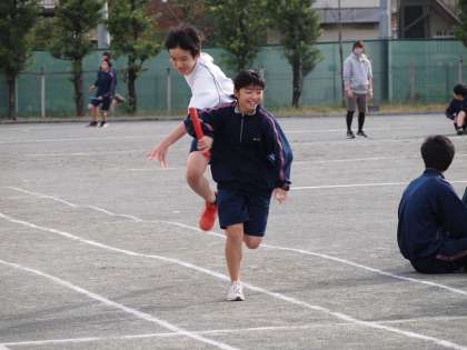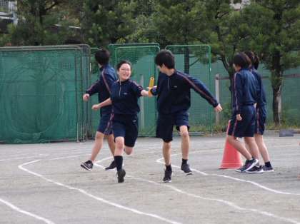 全員リレーの練習は、とにかくバトンを1秒、いや0.1秒でも早くそして正確につなぐことに全勢力を注ぎます。でも、走っているうちには疲労も出てくるし、そんなうまくはいきません。でも、待っている相手がいると思うとがんばれる!そんなフナキボ9期生たちです。