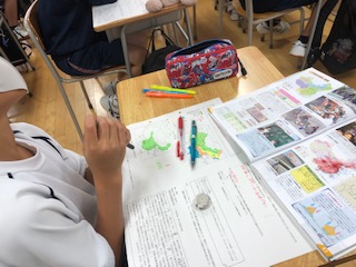本日の一年生の地理では、二枚の中国の白地図に色をたくさん塗って、東部と西部の格差について気付き、情報番組の映像資料からその課題を考えました。