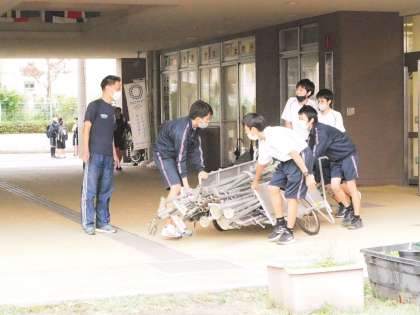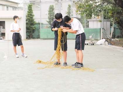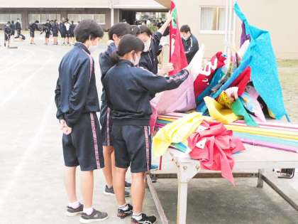 朝礼台の前では他のクラスの旗を見ての講評会が。。でもみんな褒めることばかり。それだけ気合が入っているということですね。とにかく、こういう時にふざけることなく前向きにやるのがフナキボです。