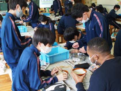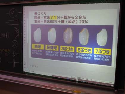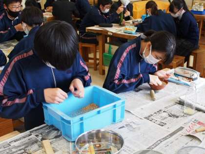 9期生の技術は精米を学んでいます。お米って実は食べられる状態にするまでたくさんの工程があることを学ぶ授業です。千歯こきやすりこぎ、そしてビンで胚芽を落とす作業まで全て手作業で玄米にします。