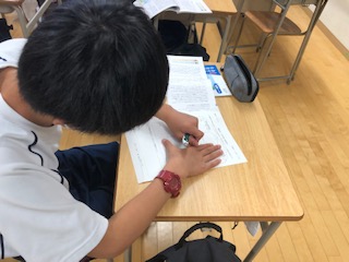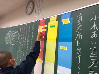 一年六組の道徳では「きまり」について、野菜の直売所を題材にした資料から考えました。自分の意思を色別で表示します。赤は「反対」、黄色は「わからない」、青は「賛成」です。またその色の濃さで思いの強さを表します。写真の生徒は強めの反対のようです。