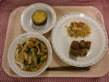 デザートは、今が旬の「焼きいも」です。給食では、オーブンでゆっくり蒸し焼きにしてから高温で焼いて出しました。味わって食べてください。