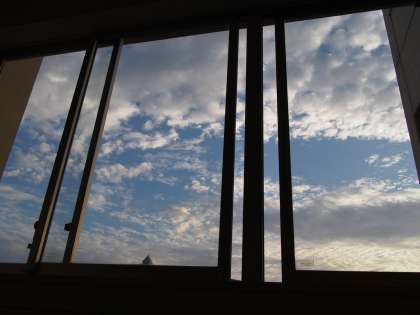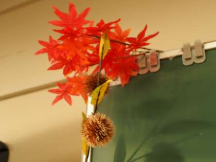 早朝の校舎からは秋の色が目に入ってきます。教室の黒板横にある秋色、そして踊り場や廊下の突き当たりにある東側の窓から見える秋色。季節のうつろいを感じます。