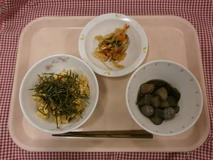 今日の丼は、「親子丼」です。親子丼は、鶏肉を卵でとじた丼ぶりです。今日の給食では、鶏肉や卵だけでなく、さやいんげんやにんじんなど具だくさんにしました。